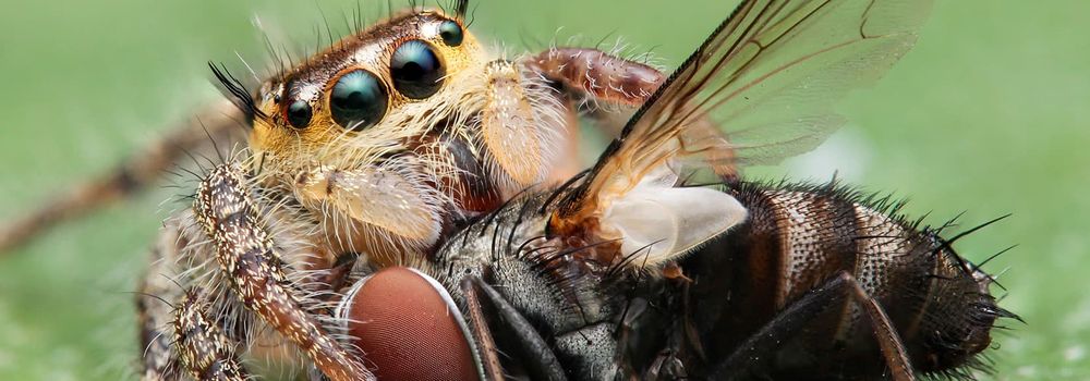 Jumping spiders eat small insects and arthropods.
